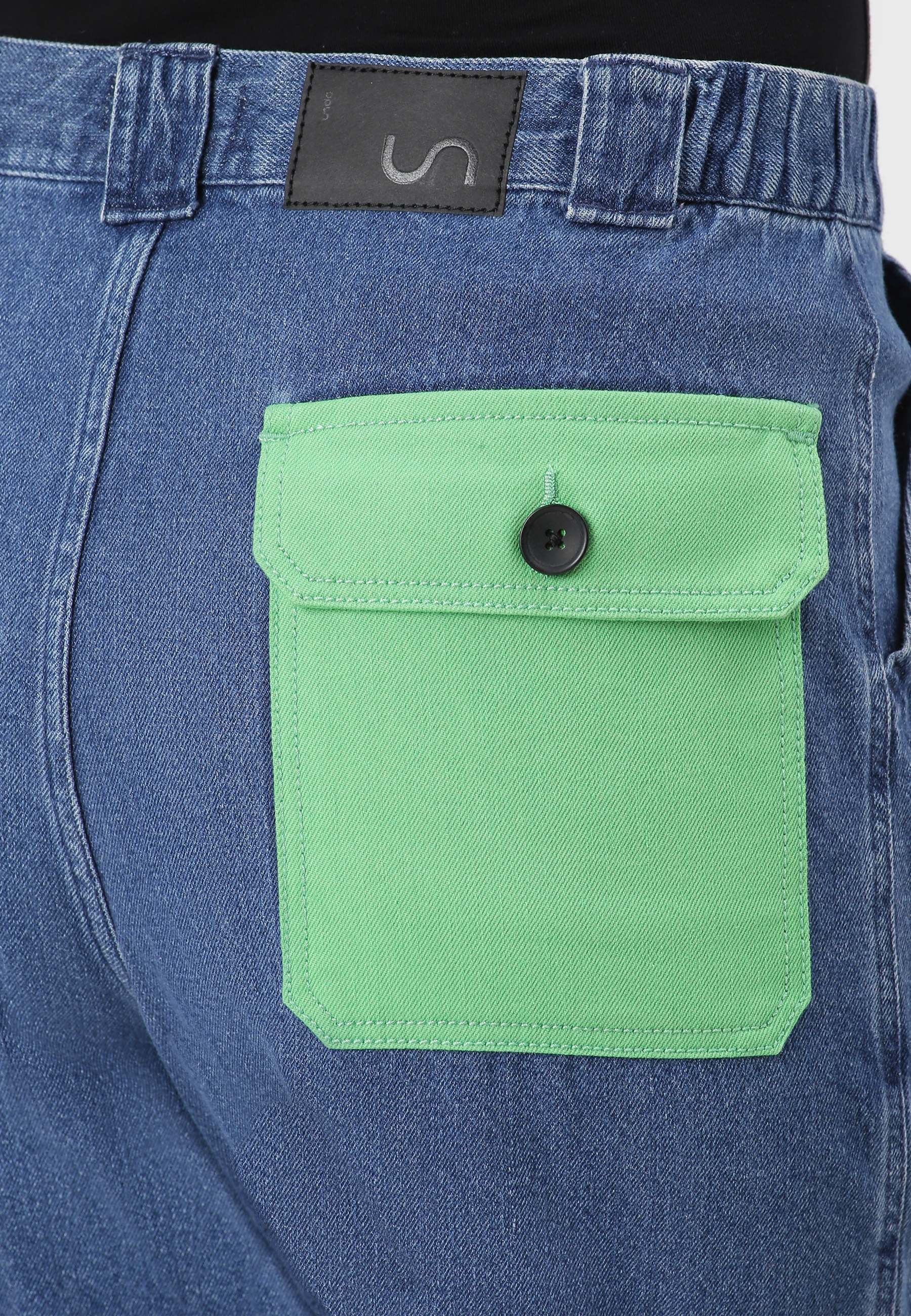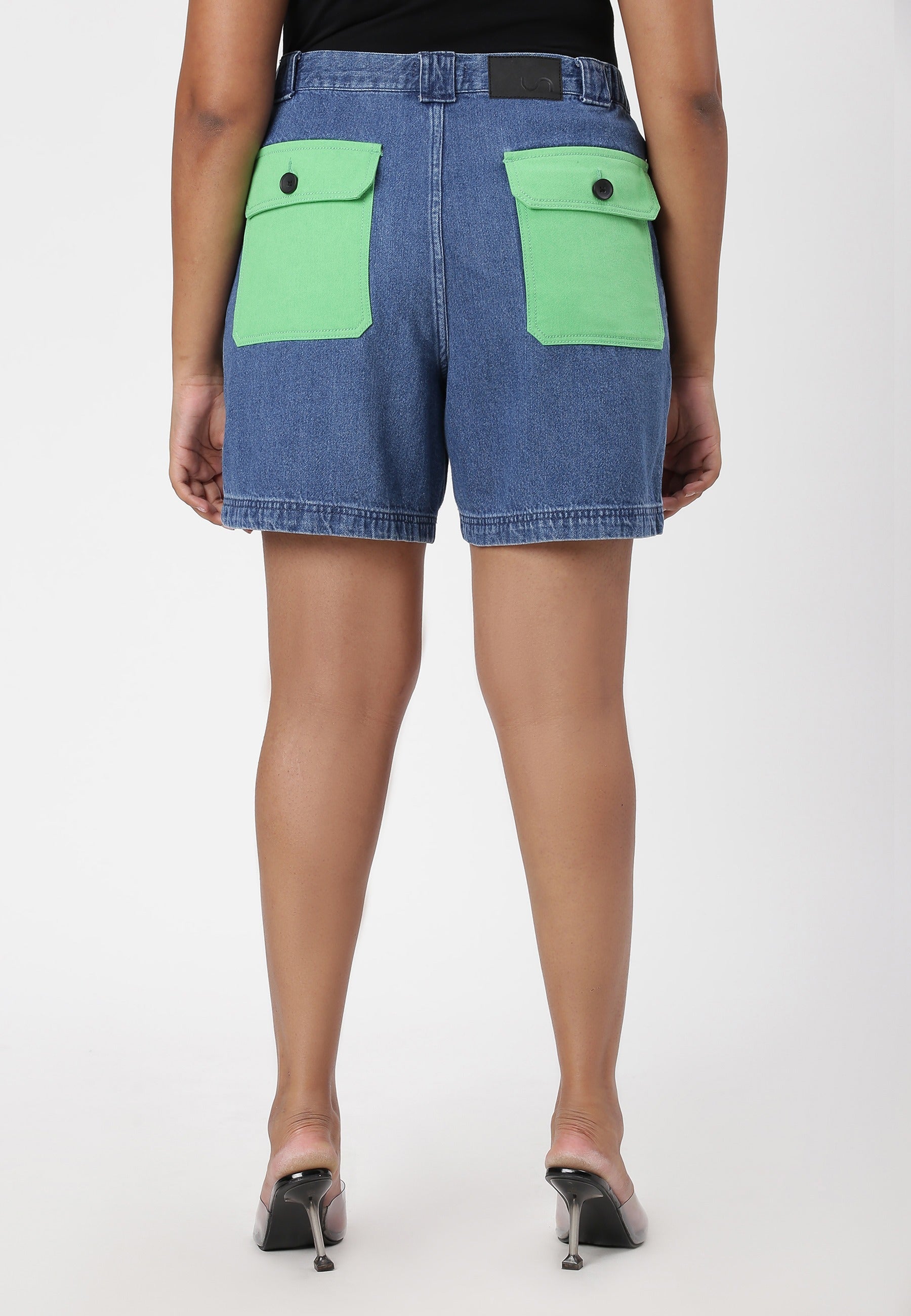 Women's mid indigo mom fit denim shorts that sit high on the waist with wide leg openings. They fit loose around the upper thigh, flaring out slightly from the waist. They come with bold, bright green back pockets.