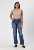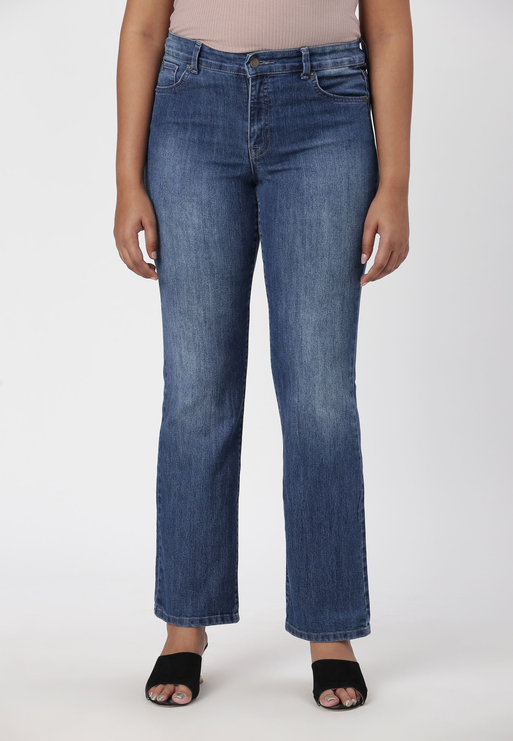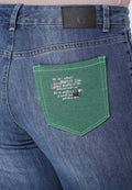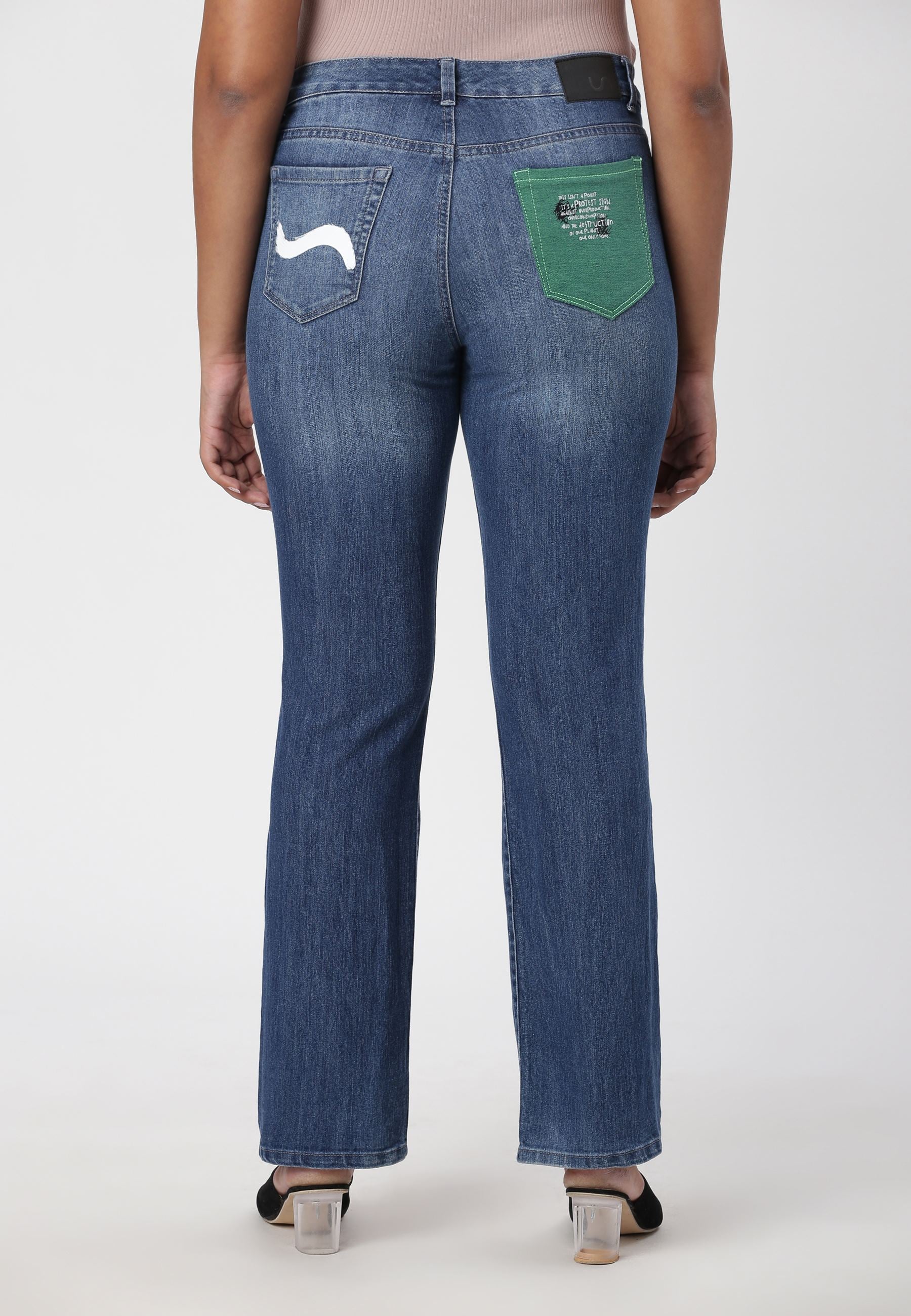 Women's mid indigo straight jeans that sit high on the waist with narrow leg openings. They fit fuller through the hip and thigh and run straight from hip to ankle. They feature Un Denim's signature GreenPocket™ that says - ‘This is not a green pocket, it’s a protest sign, against overproduction, overconsumption and the destruction of our planet, our only home.’