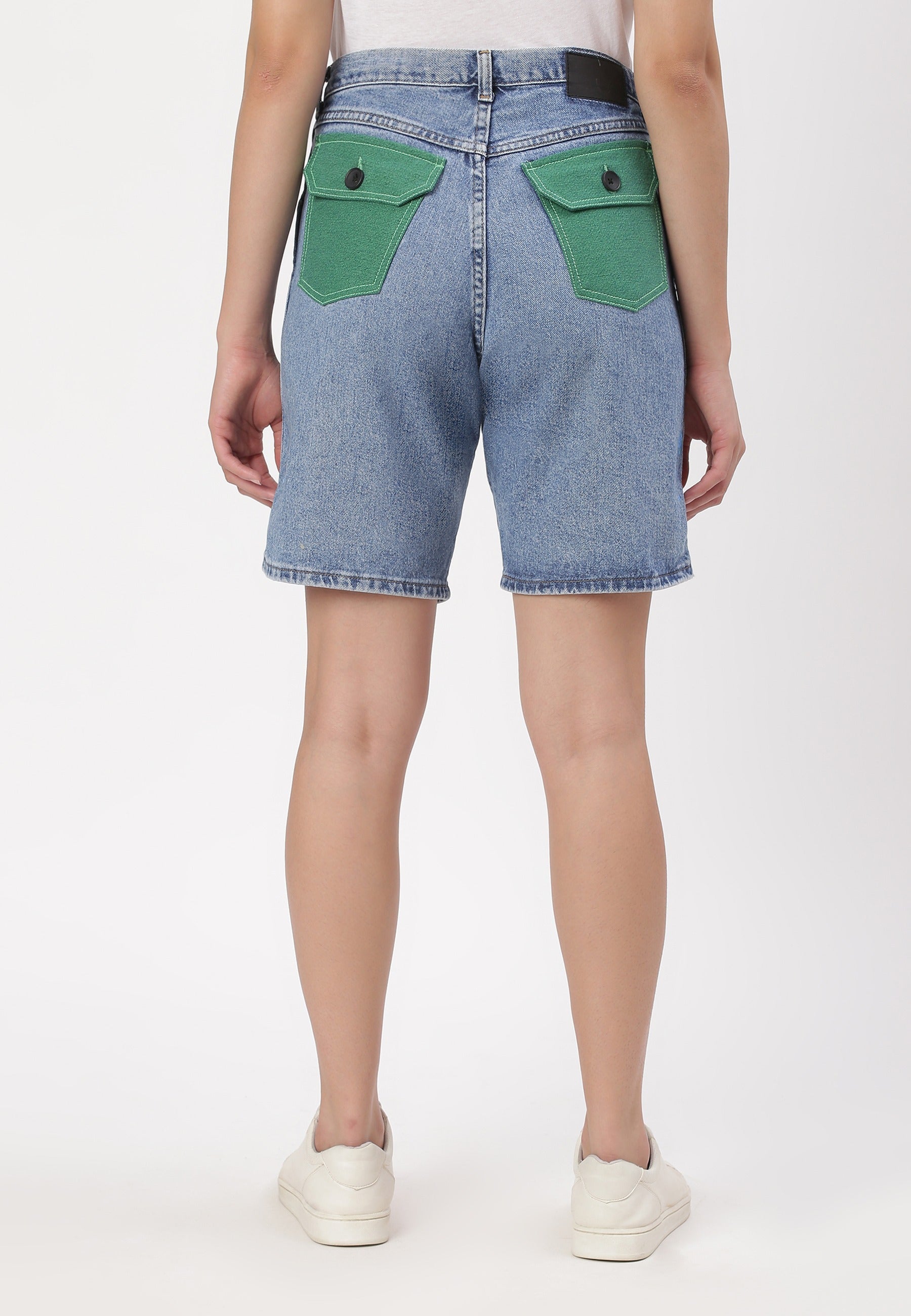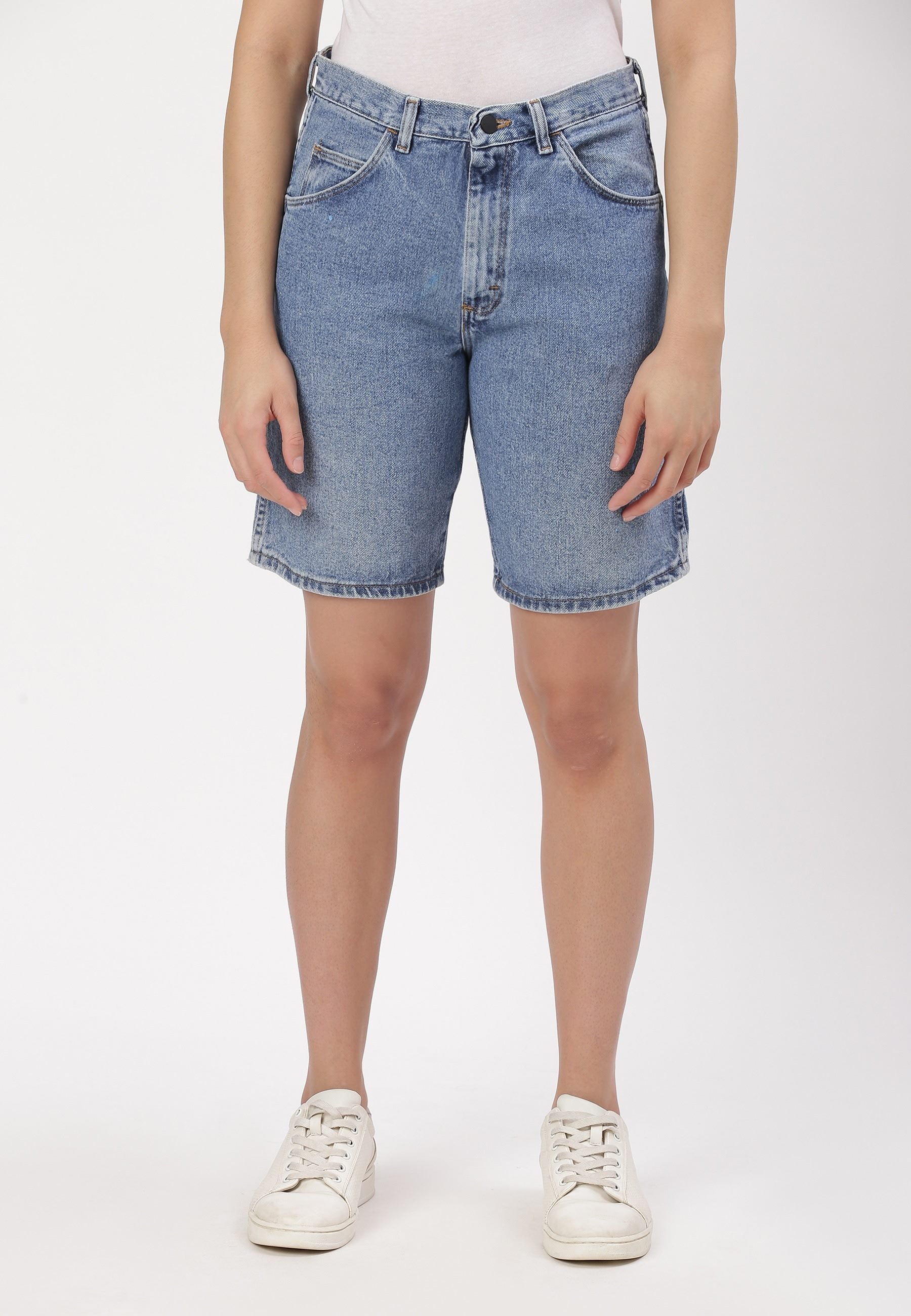 Women's mid indigo straight denim shorts that sit high on the waist with narrow leg openings. They fit fuller through the hip and thigh and run straight from hip to hem. They placeholder for RS63