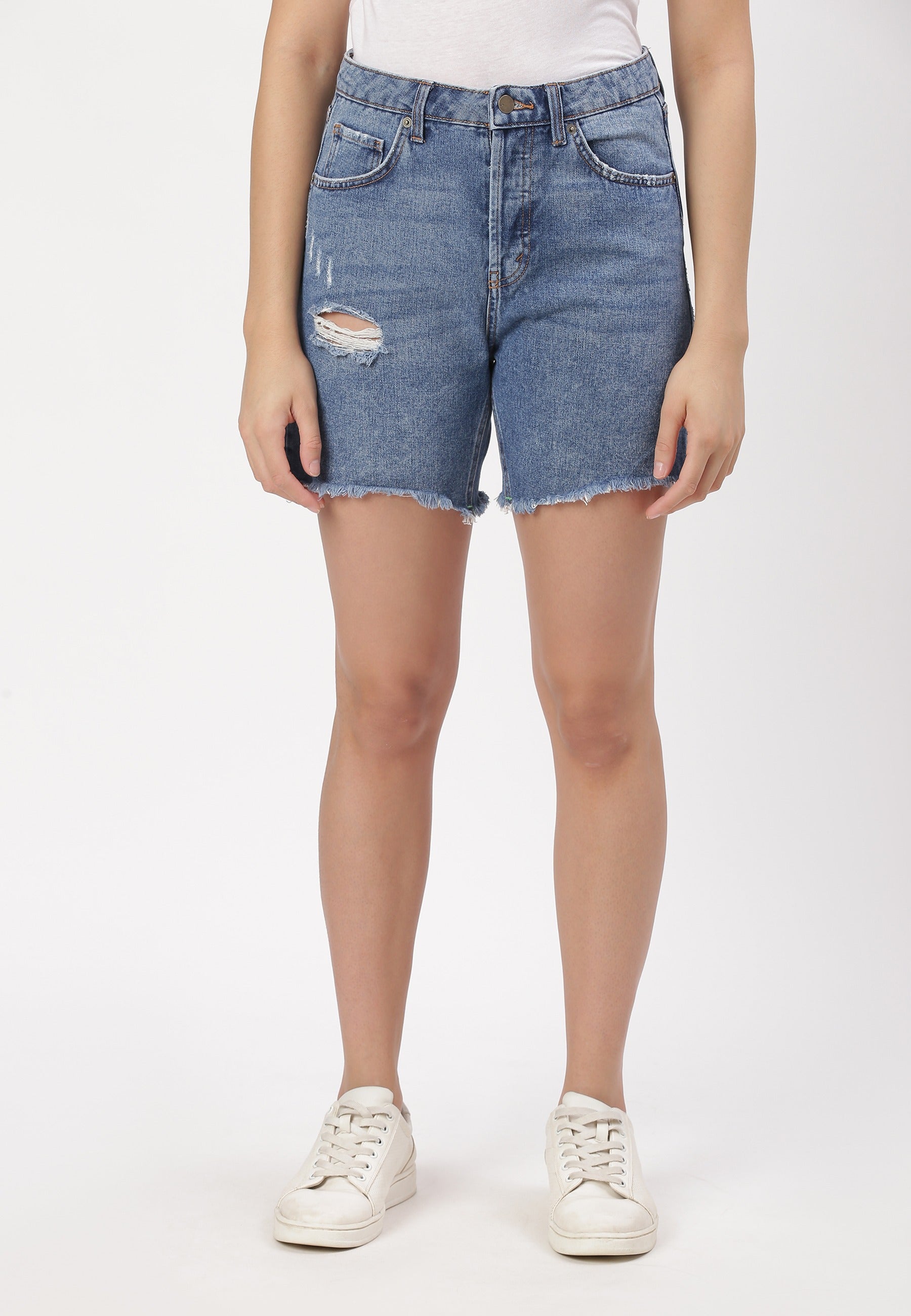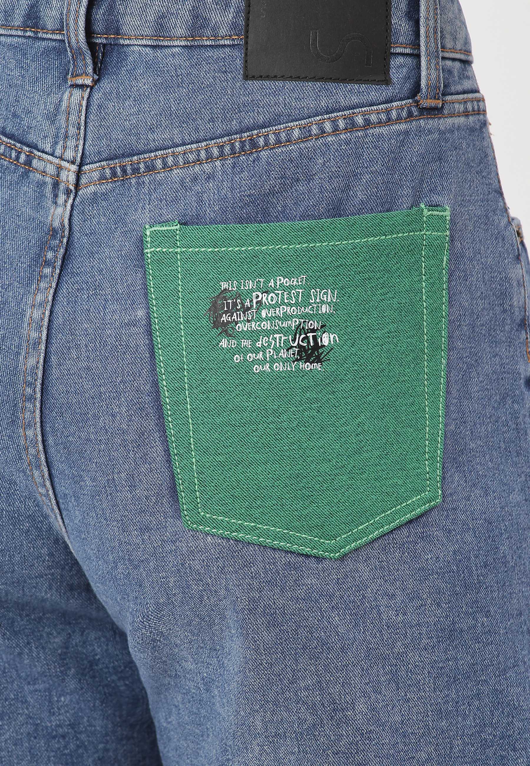 Women's mid indigo straight denim shorts that sit high on the waist with narrow leg openings. They fit fuller through the hip and thigh and run straight from hip to hem. They feature Un Denim's signature GreenPocket that says - ˜This is not a green pocket, its a protest sign, against overproduction, overconsumption and the destruction of our planet, our only home.™