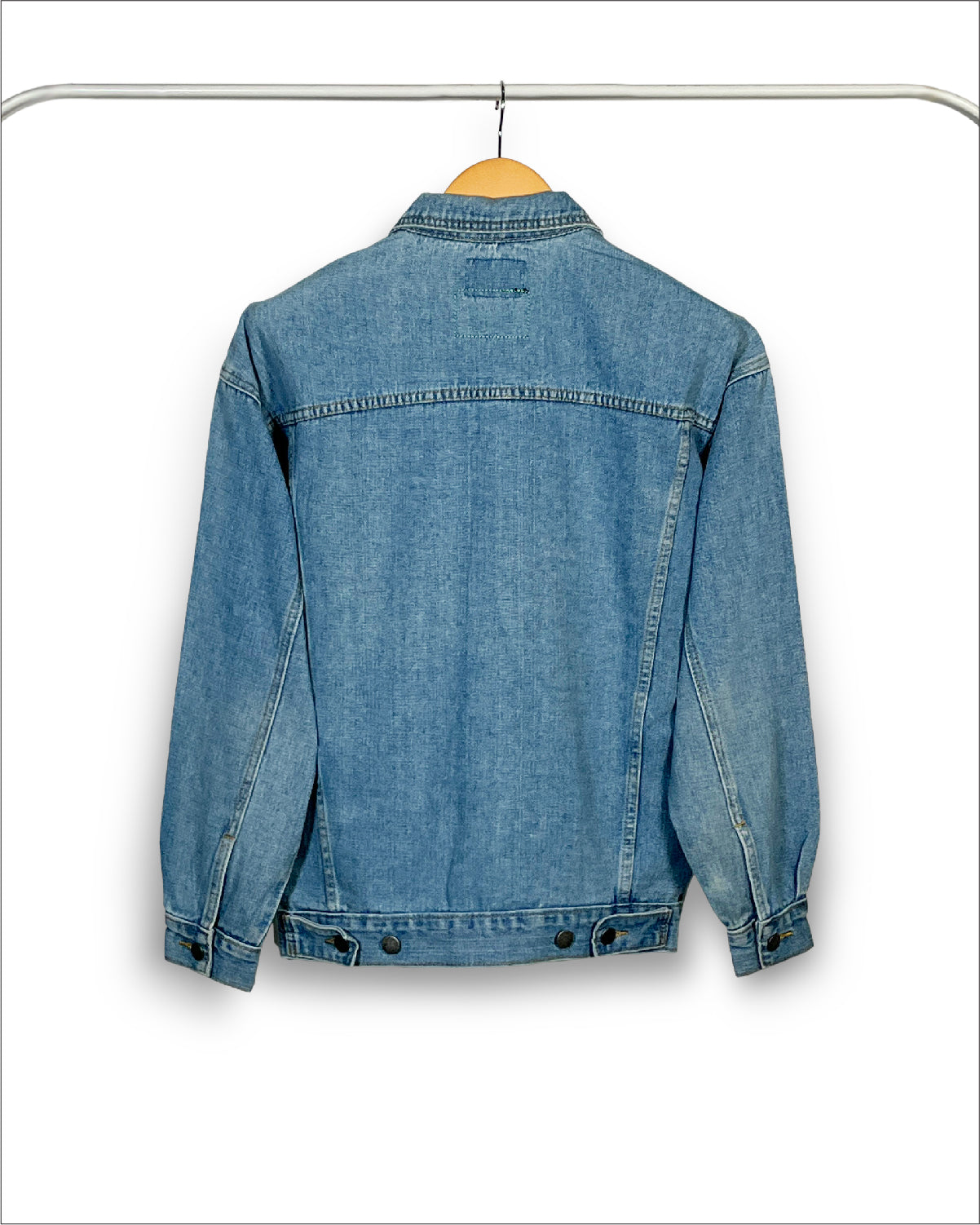 Women's mid indigo trucker denim jacket. An iconic jacket style with a slim casual cut, spread collar, pointed flap chest pockets, button tab waist adjusters, and two V-shaped seams that run from chest pocket to waist. It features Un Denim's signature GreenPocket™ that says - ‘I pledge to waste less, crave less, use less and reuse more. I pledge to rescue our future.'