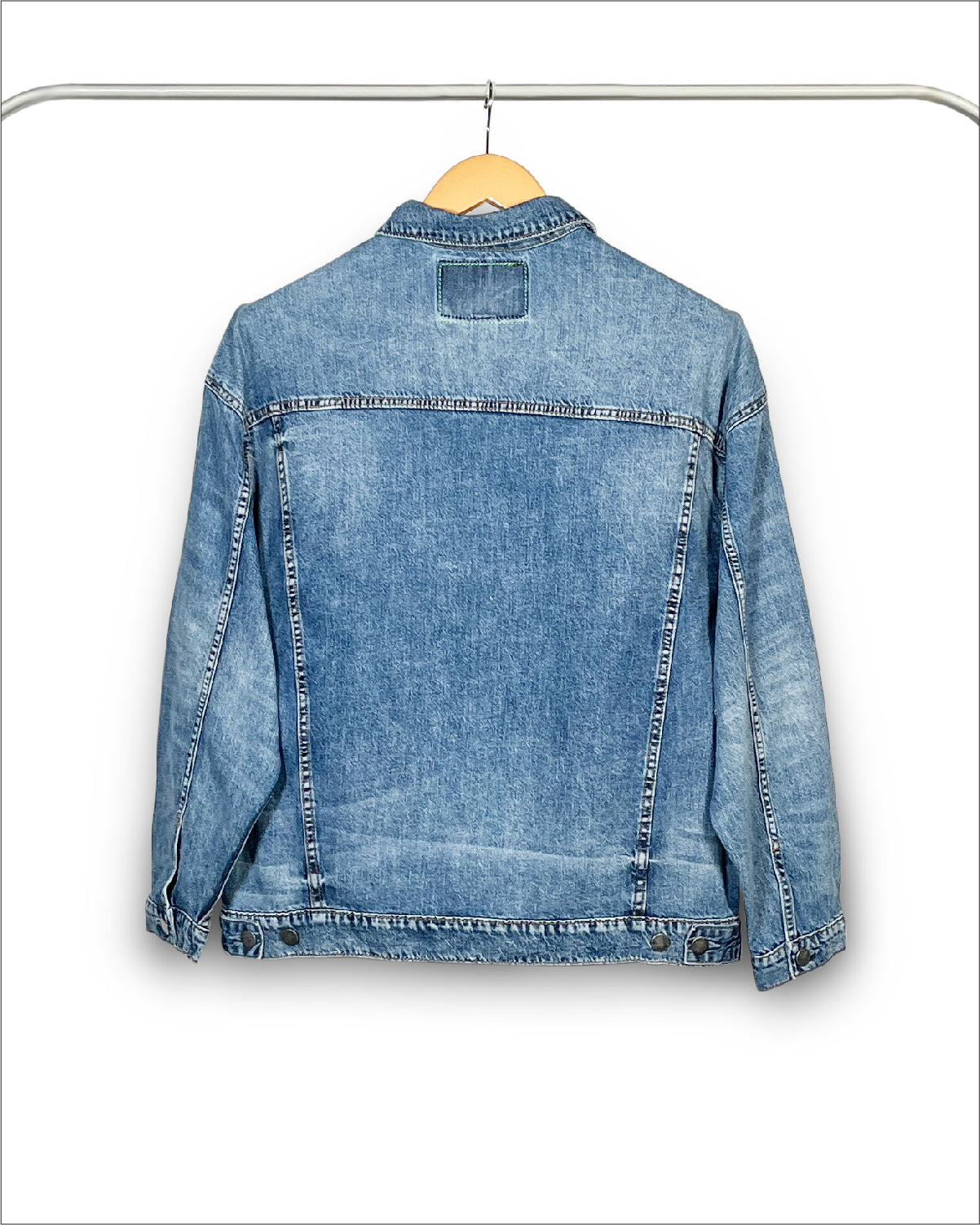 Women's mid indigo trucker denim jacket. An iconic jacket style with a slim casual cut, spread collar, pointed flap chest pockets, button tab waist adjusters, and two V-shaped seams that run from chest pocket to waist. It features Un Denim's signature GreenPocket™ that says - ‘I pledge to waste less, crave less, use less and reuse more. I pledge to rescue our future.'