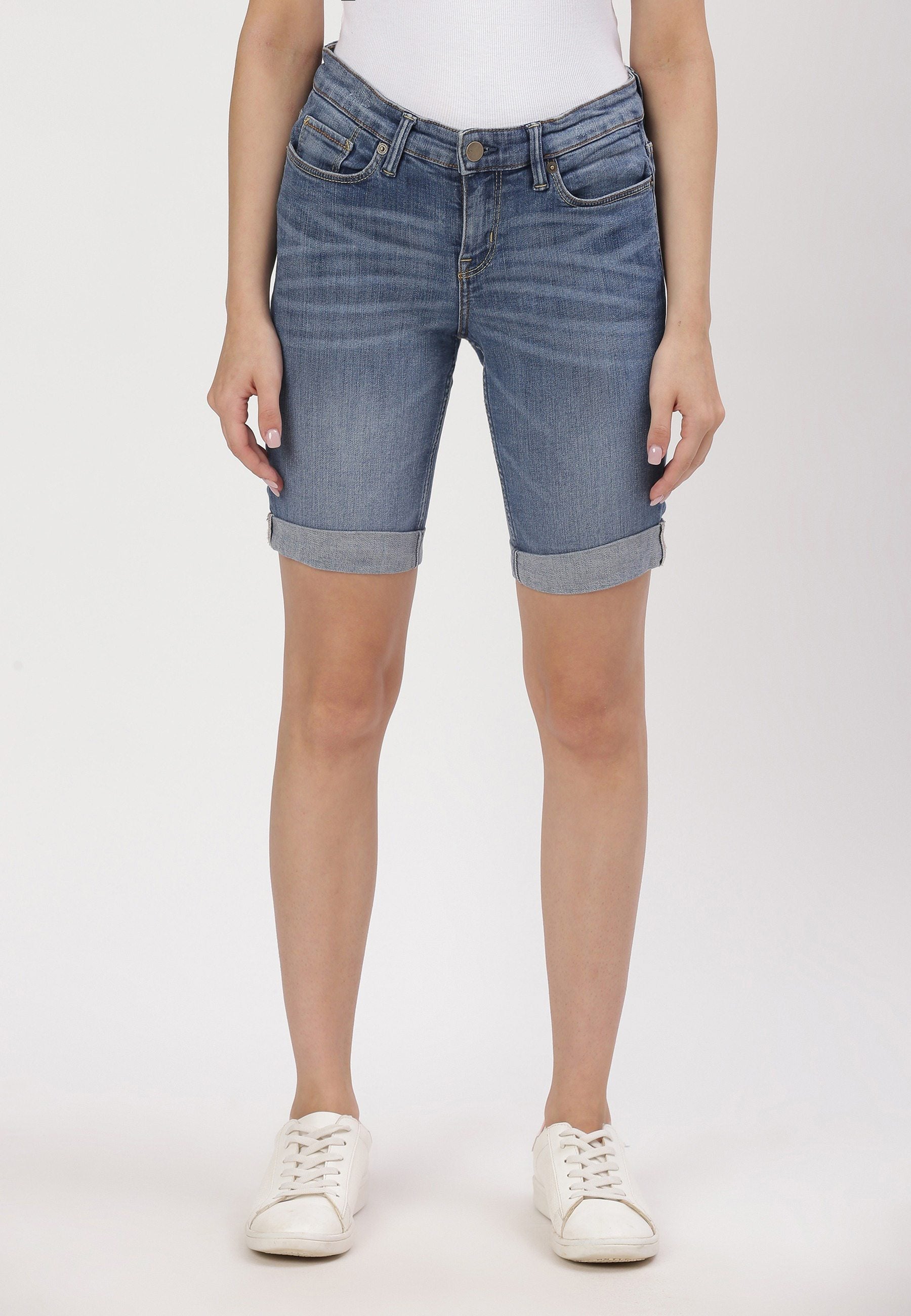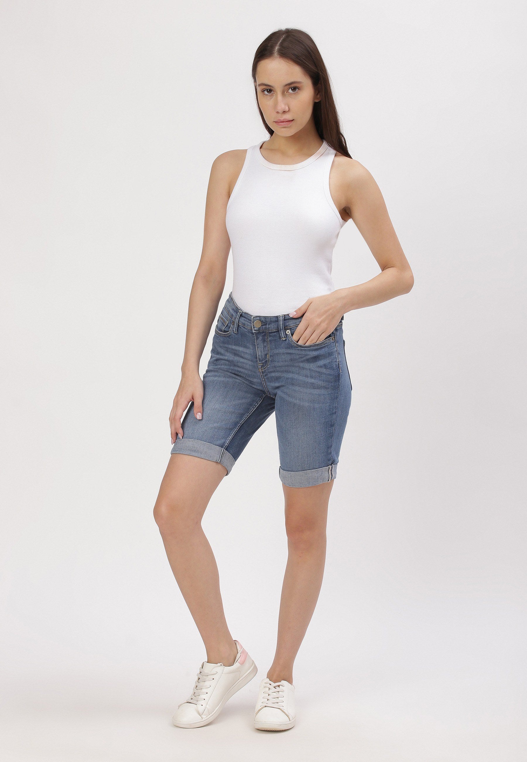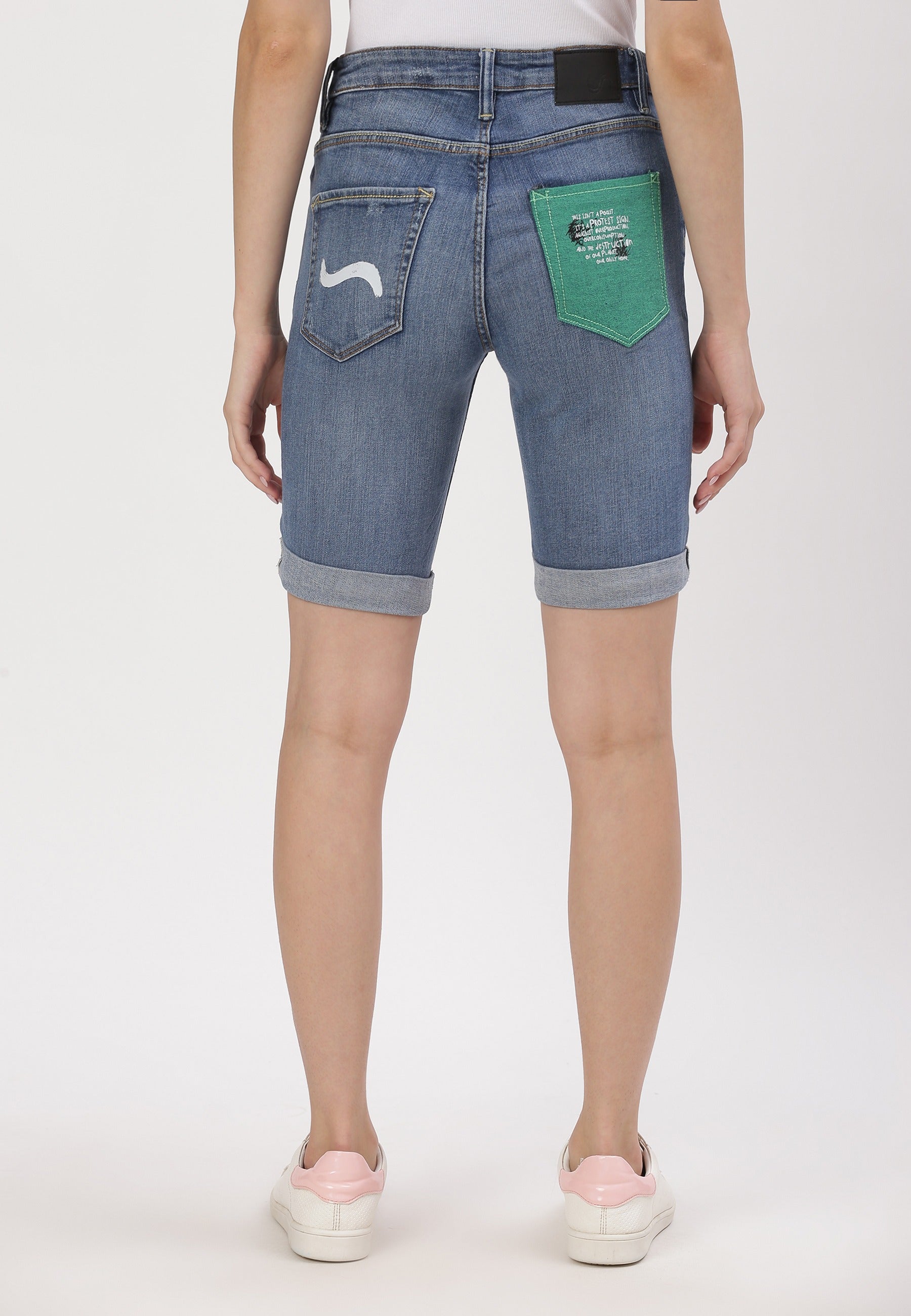 Women's mid indigo cycling denim shorts that sit low on waist with narrow leg openings. They fit snugly from thigh to knee. They feature Un Denim's signature GreenPocket™ that says - ‘This is not a green pocket, it’s a protest sign, against overproduction, overconsumption and the destruction of our planet, our only home.’