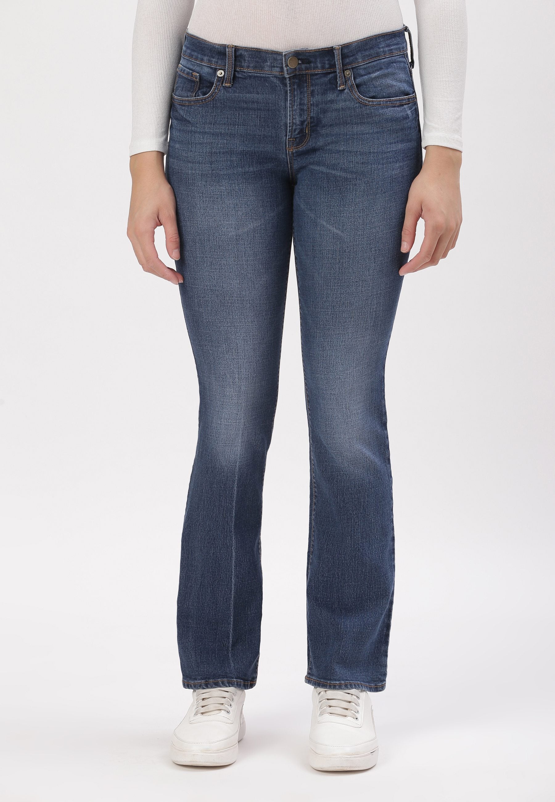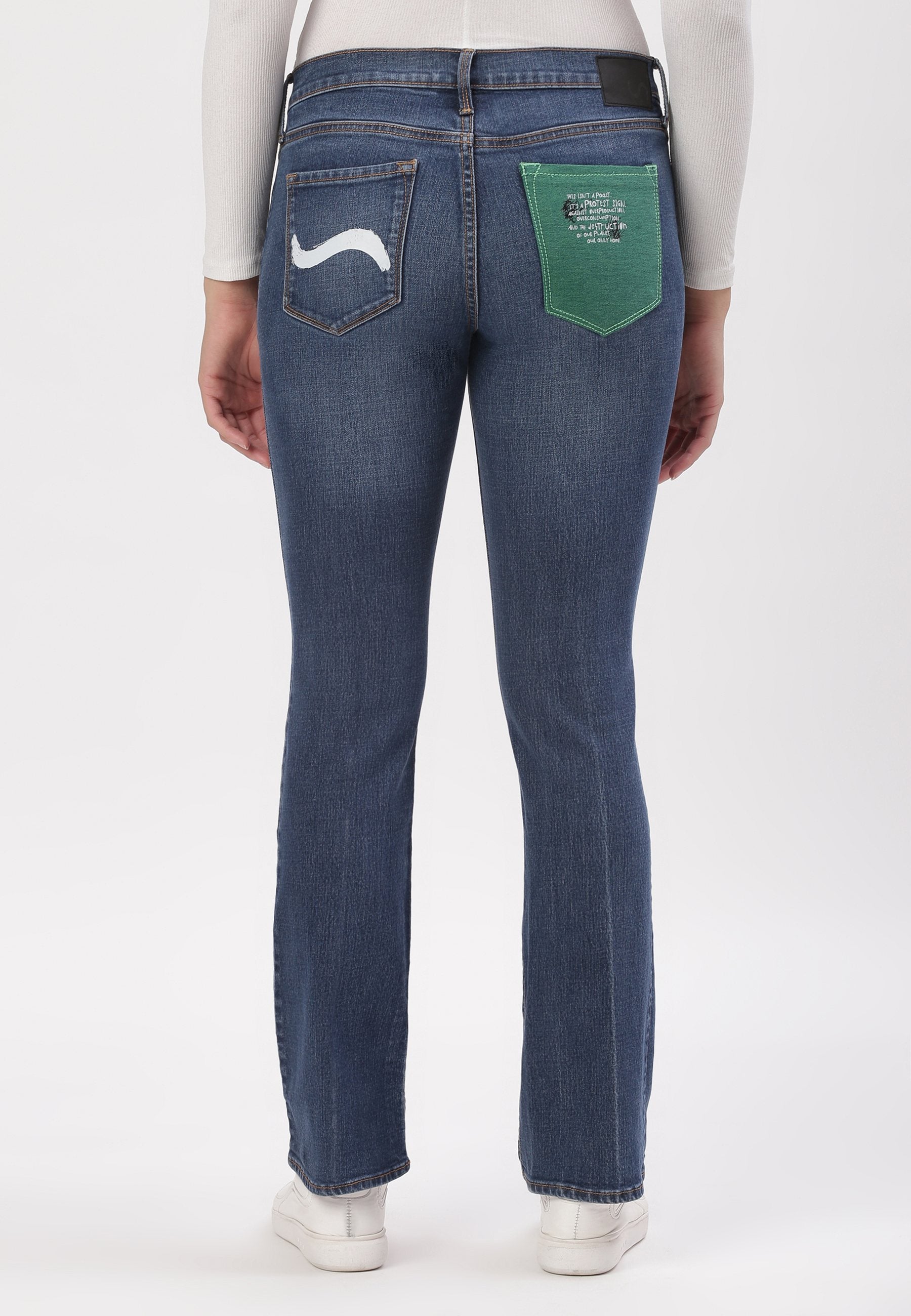 Women's dark indigo bootcut jeans that sit comfortably at the waist with wide leg openings. They fit snugly through the thigh and flare out from the knee. They feature a deep green back pocket that says - I carry ~3600 litres of saved water in this pocket.™