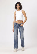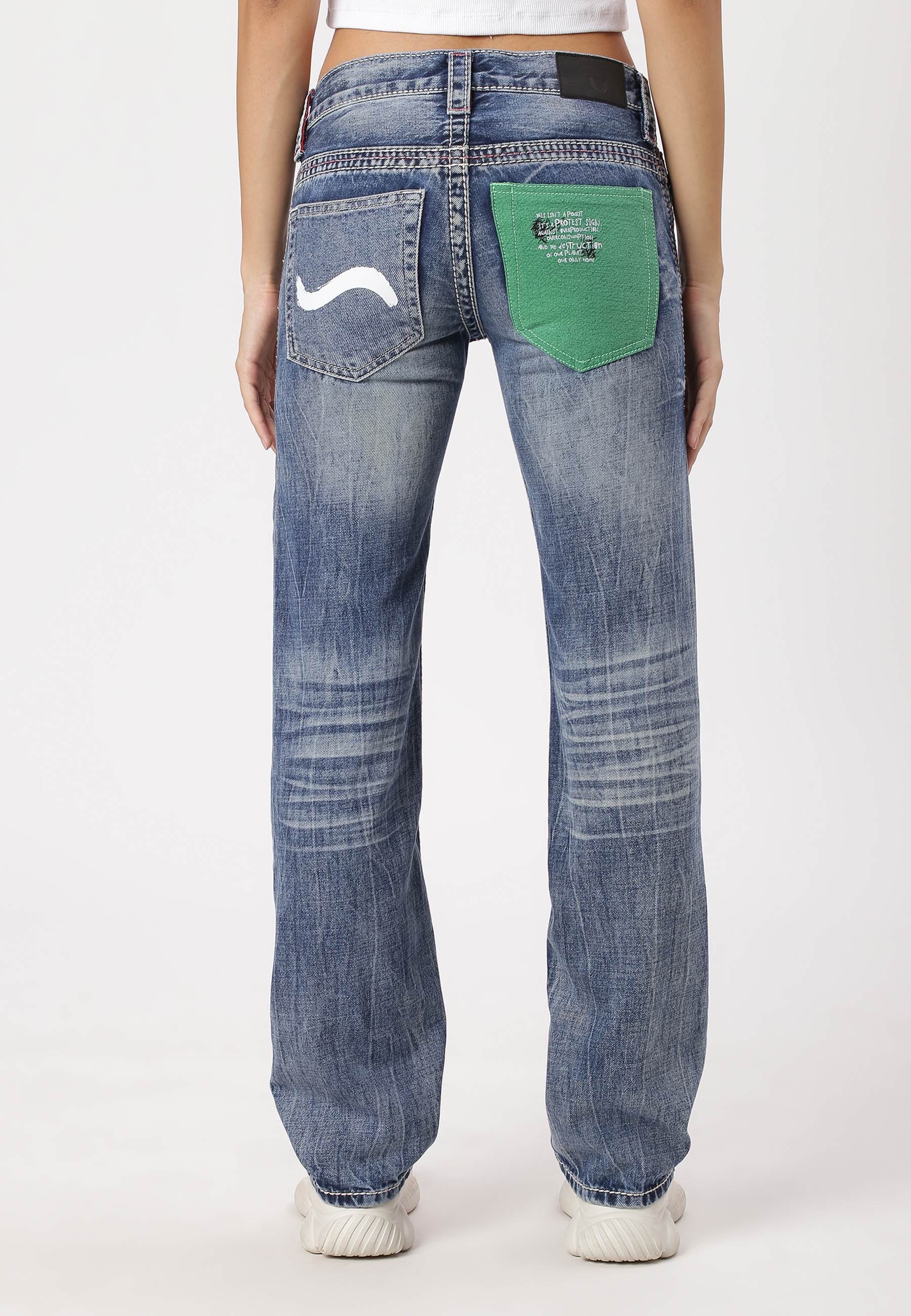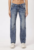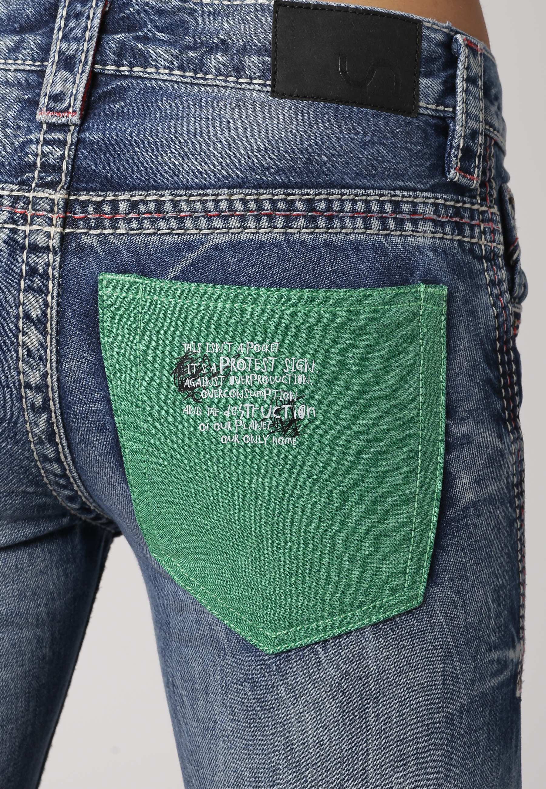 Women's mid indigo straight jeans that sit low on waist with narrow leg openings. They fit fuller through the hip and thigh and run straight from hip to ankle. They feature Un Denim's signature GreenPocket™ that says - ‘This is not a green pocket, it’s a protest sign, against overproduction, overconsumption and the destruction of our planet, our only home.’