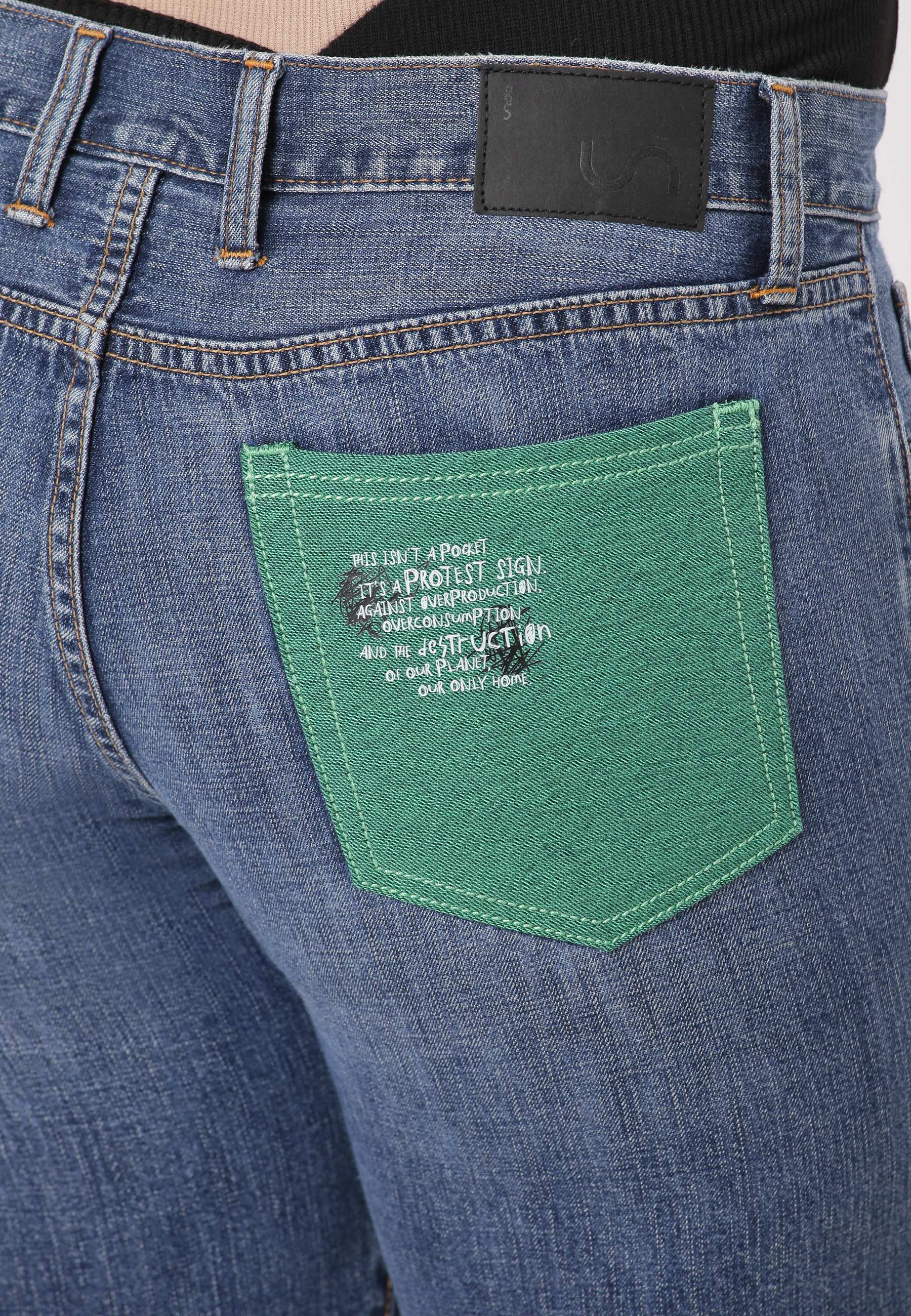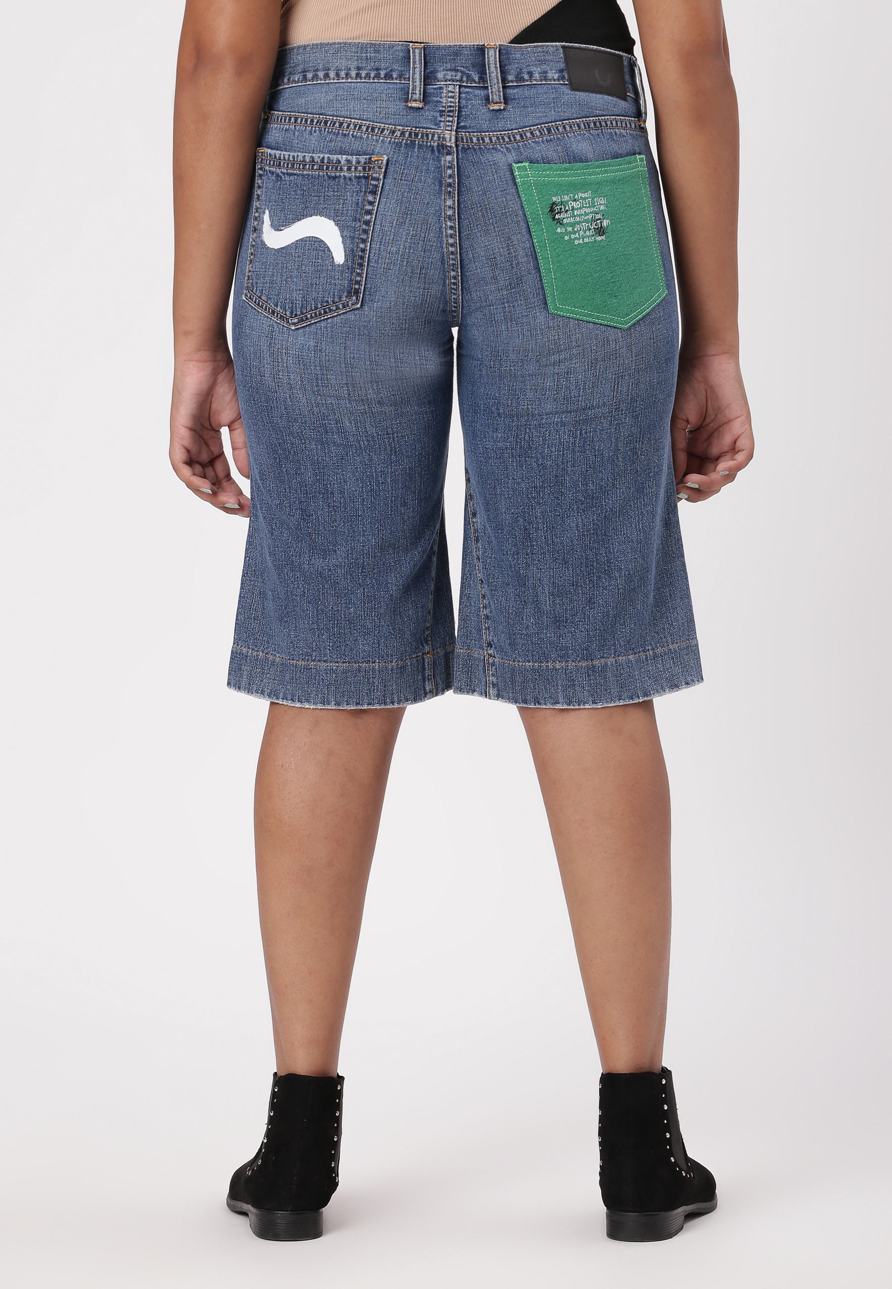 Women's mid indigo bermuda denim shorts that sit comfortably at the waist with wide leg openings. A relaxed fit around the hip and thigh. They feature Un Denim's signature GreenPocket that says - ˜This is not a green pocket, its a protest sign, against overproduction, overconsumption and the destruction of our planet, our only home.™