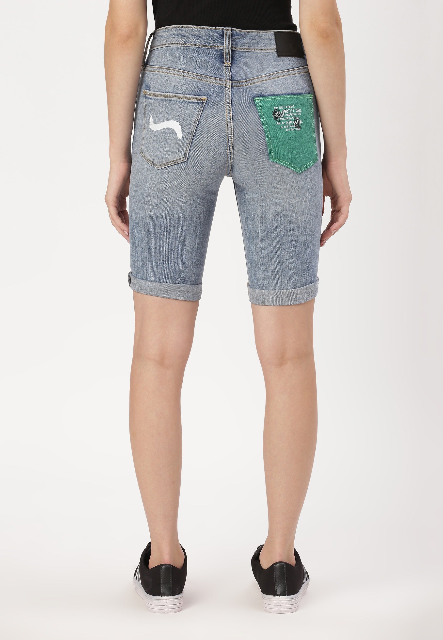 Women's mid indigo cycling denim shorts that sit comfortably at the waist with narrow leg openings. They fit snugly from thigh to knee. They feature Un Denim's signature GreenPocket™ that says - ‘This is not a green pocket, it’s a protest sign, against overproduction, overconsumption and the destruction of our planet, our only home.’