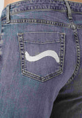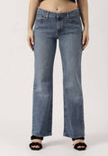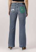 Women's mid indigo bootcut jeans that sit comfortably at the waist with wide leg openings. They fit snugly through the thigh and flare out from the knee. They feature Un Denim's signature GreenPocket that says - This is not a green pocket, its a protest sign, against overproduction, overconsumption and the destruction of our planet, our only home.™