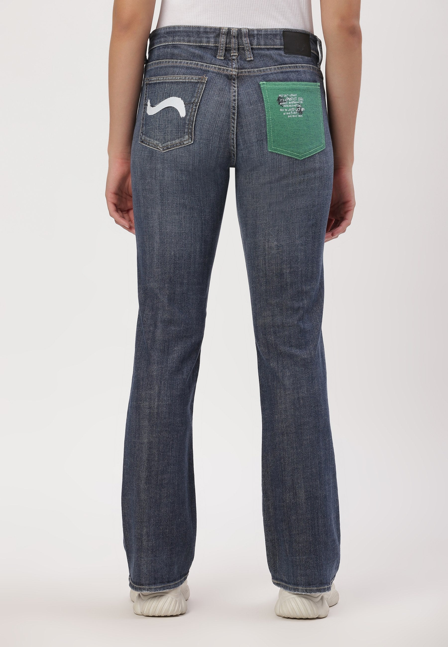 Women's dark indigo bootcut jeans that sit comfortably at the waist with wide leg openings. They fit snugly through the thigh and flare out from the knee. They feature a deep green back pocket that says - I carry ~3600 litres of saved water in this pocket.™