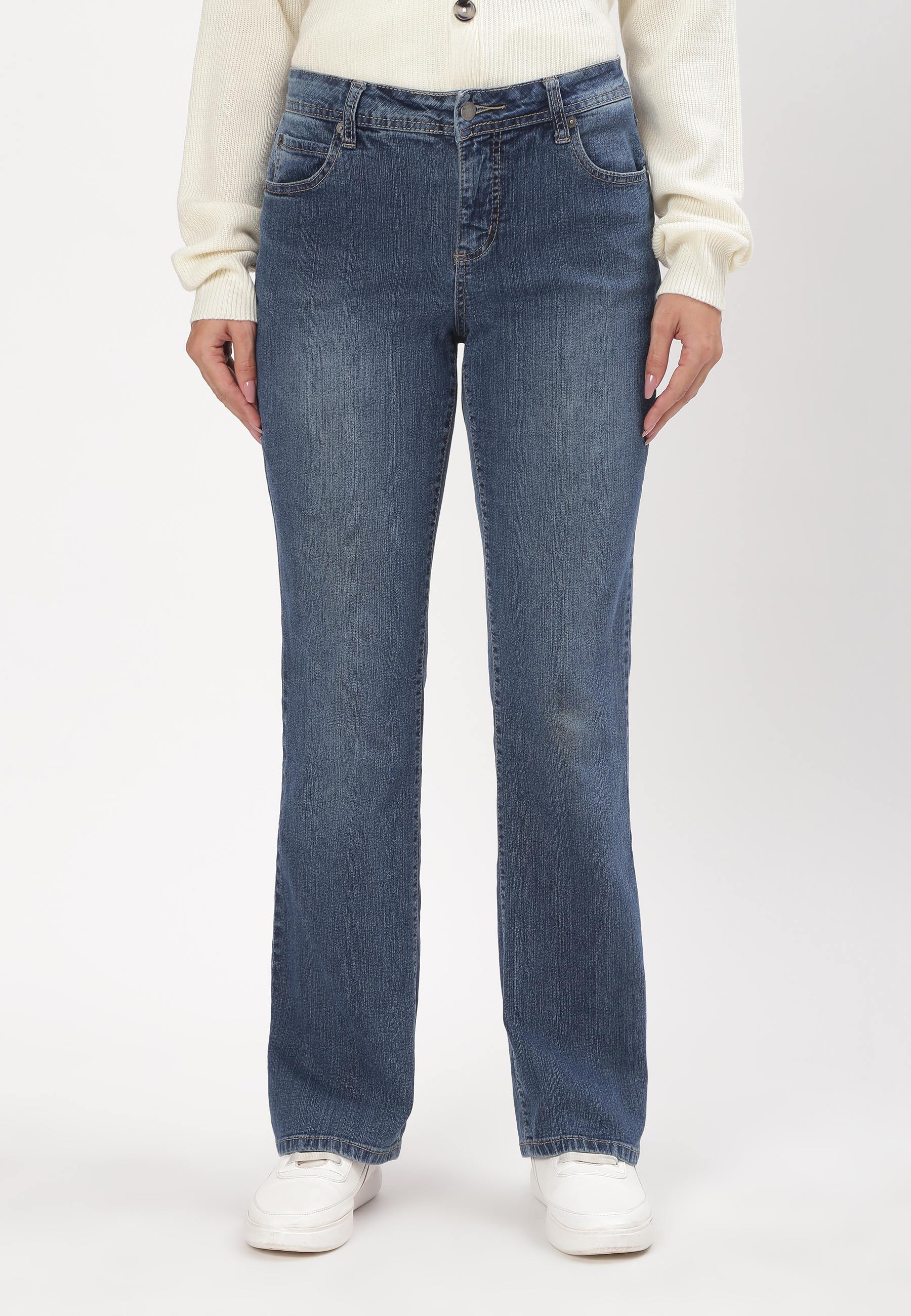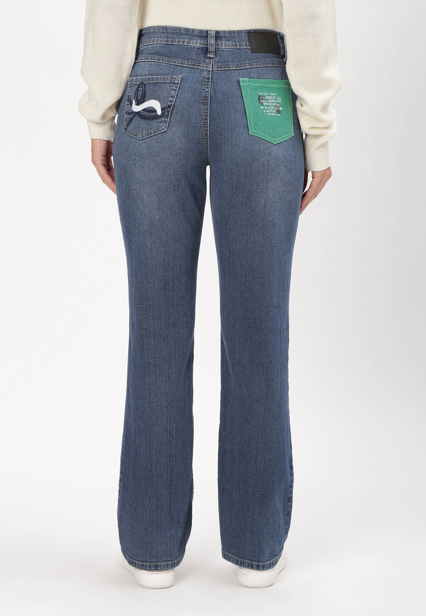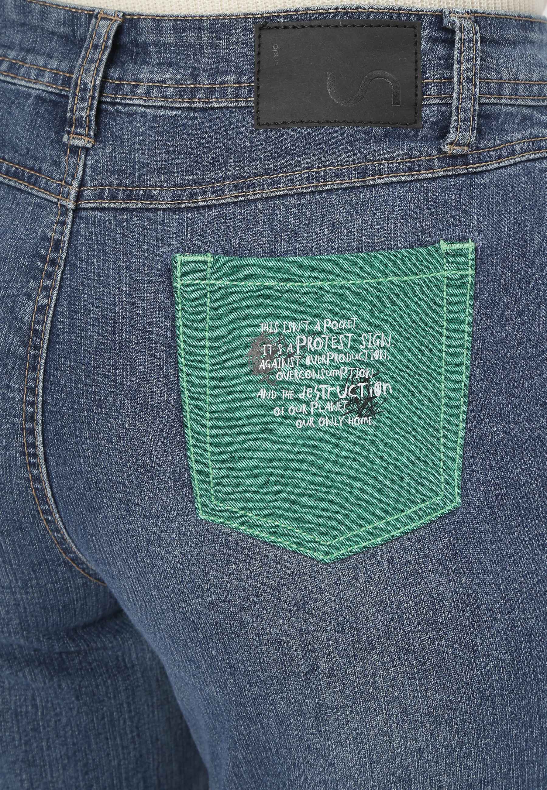 Women's mid indigo straight jeans that sit comfortably at the waist with narrow leg openings. They fit fuller through the hip and thigh and run straight from hip to ankle. They feature Un Denim's signature GreenPocket™ that says - ‘This is not a green pocket, it’s a protest sign, against overproduction, overconsumption and the destruction of our planet, our only home.’