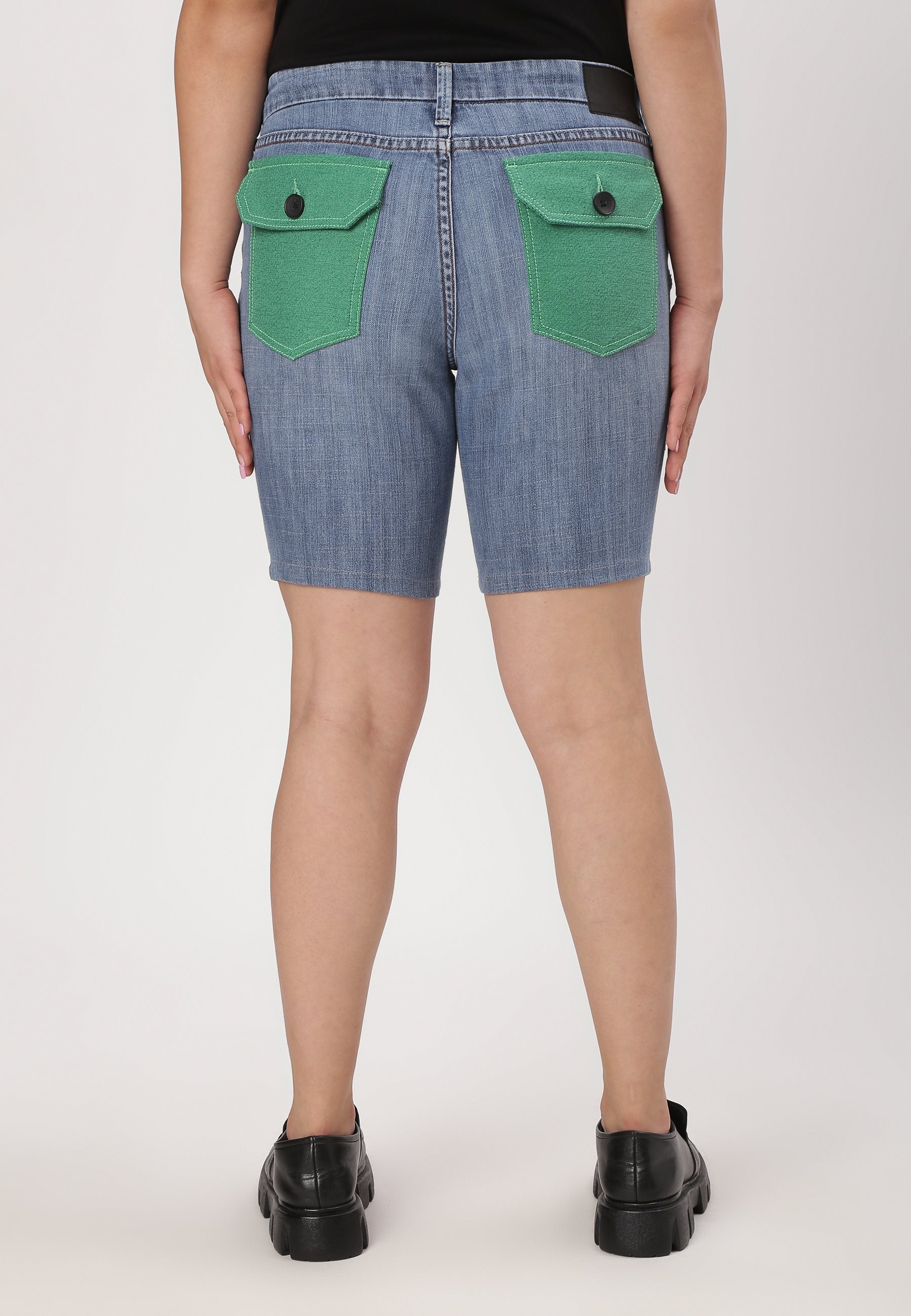 Women's mid indigo straight denim shorts that sit comfortably at the waist with narrow leg openings. They fit fuller through the hip and thigh and run straight from hip to hem. They placeholder for RS63