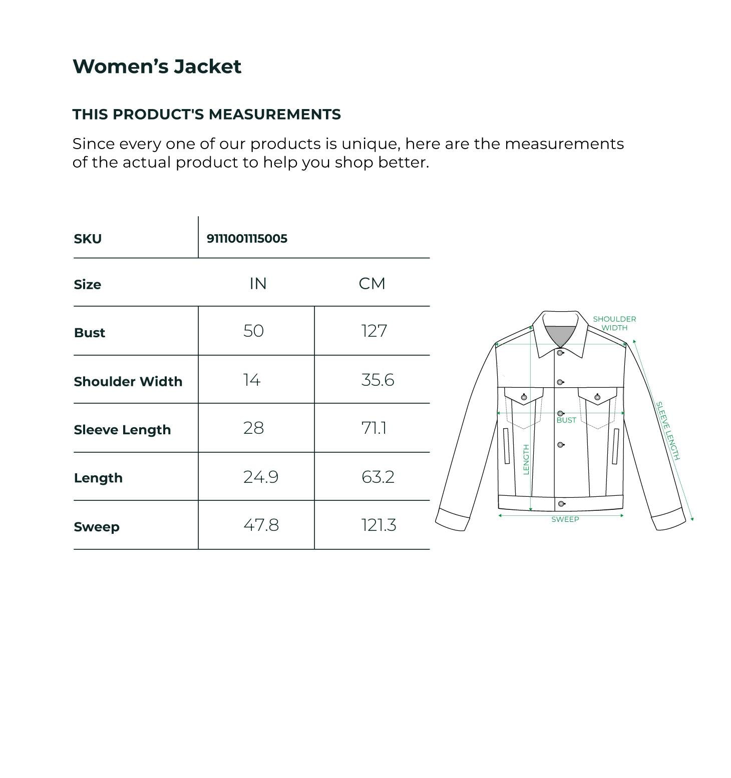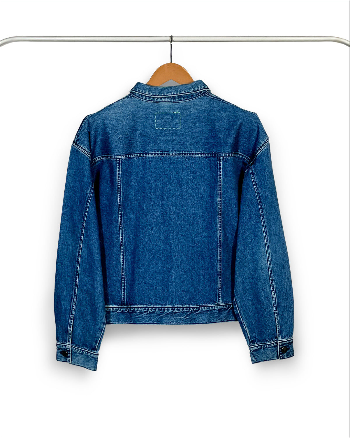 Women's mid indigo trucker denim jacket. An iconic jacket style with a slim casual cut, spread collar, pointed flap chest pockets, button tab waist adjusters, and two V-shaped seams that run from chest pocket to waist. It features Un Denim's signature GreenPocket™ that says - ‘I pledge to waste less, crave less, use less and reuse more. I pledge to rescue our future.'