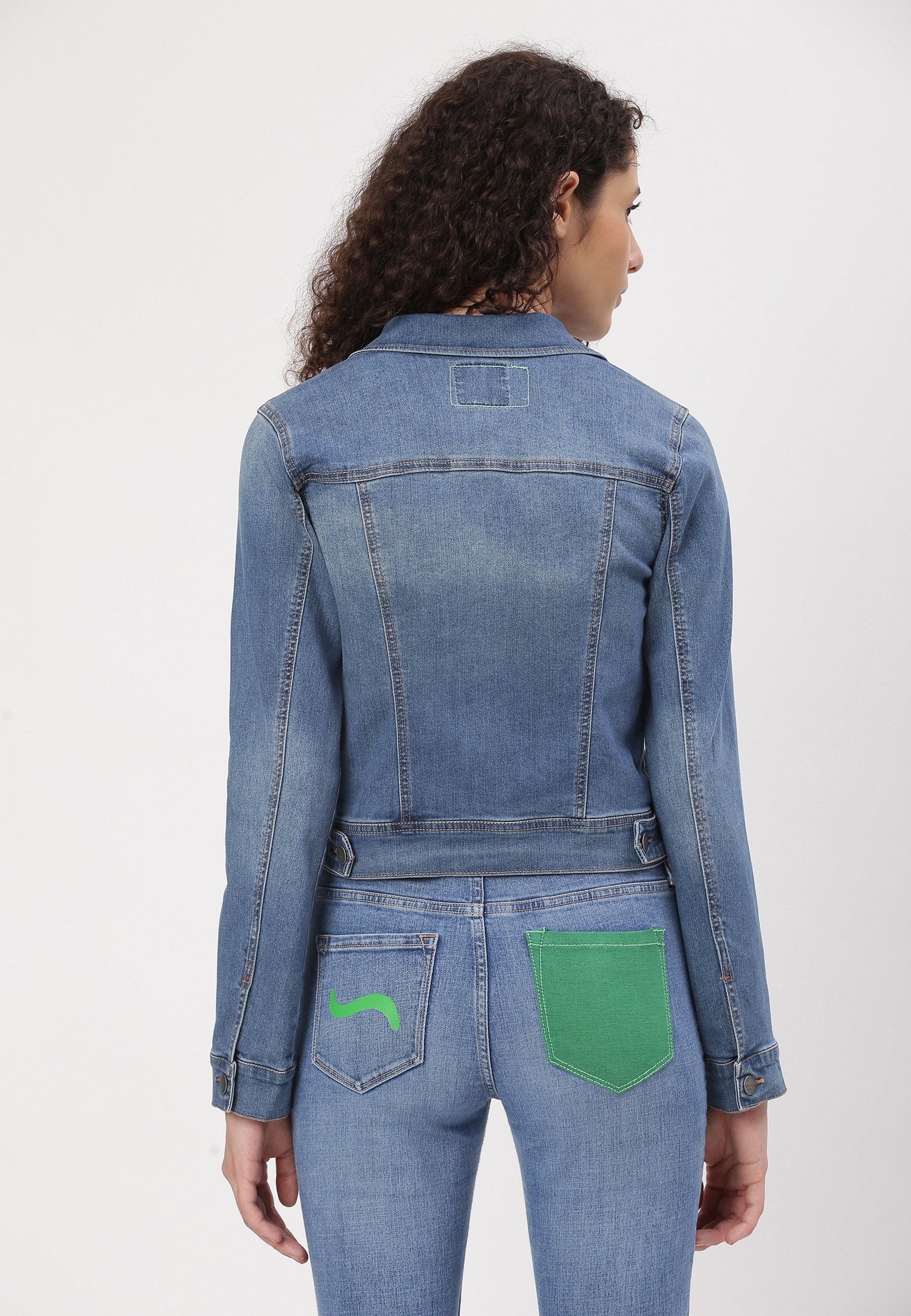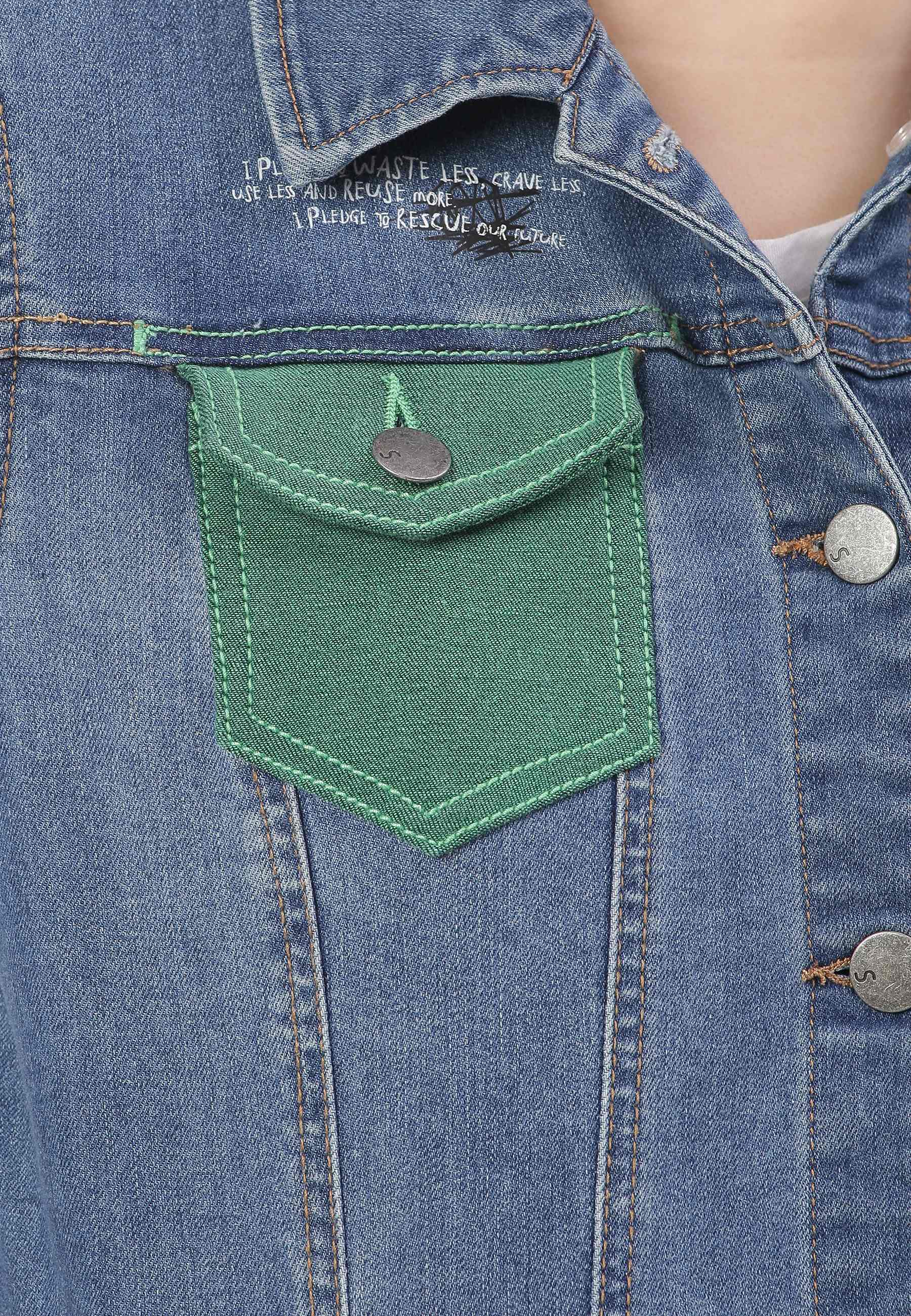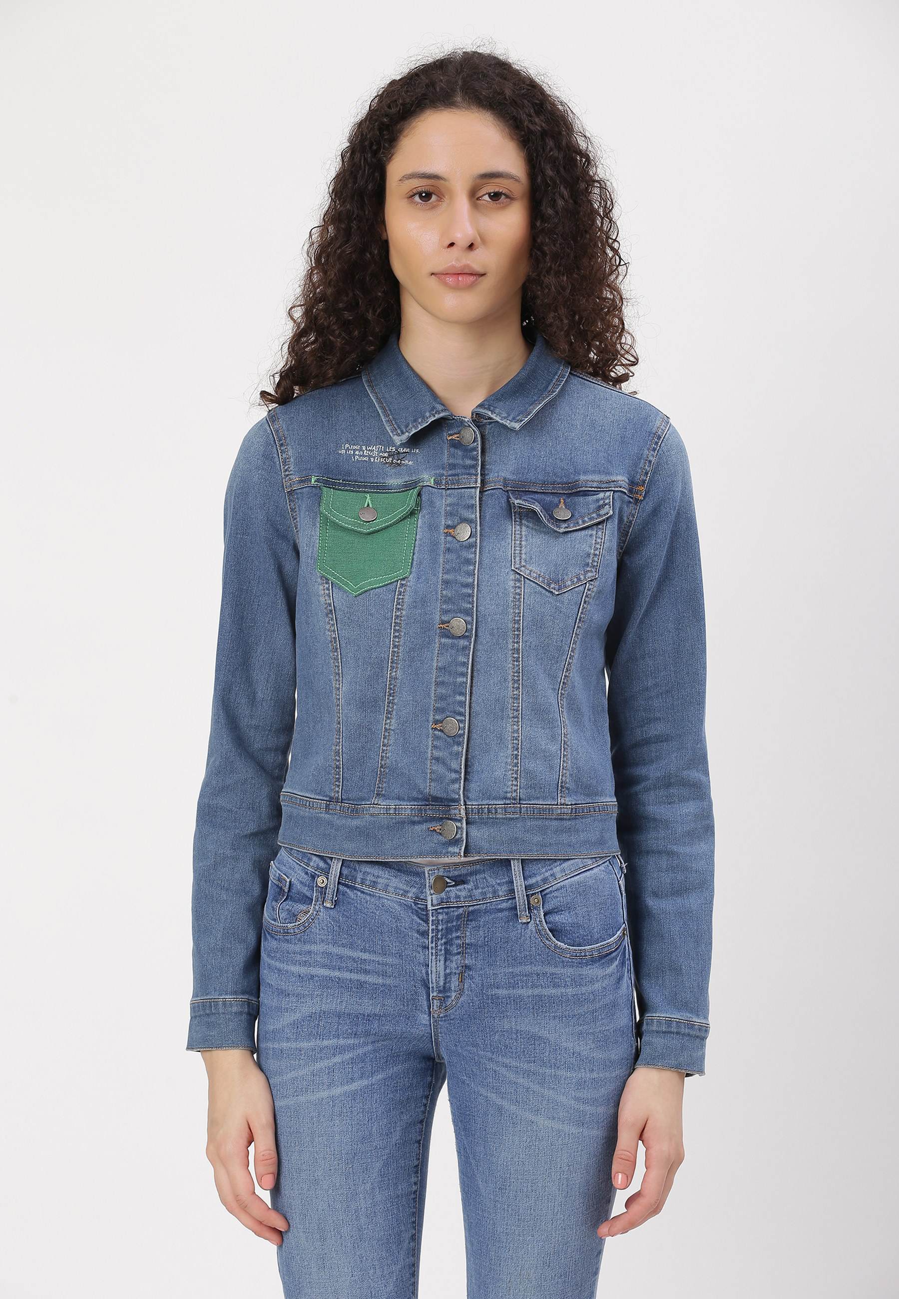 Women's mid indigo trucker denim jacket. An iconic jacket style with a slim casual cut, spread collar, pointed flap chest pockets, button tab waist adjusters, and two V-shaped seams that run from chest pocket to waist. It features Un Denim's signature GreenPocket™ that says - ‘I pledge to waste less, crave less, use less and reuse more. I pledge to rescue our future.'