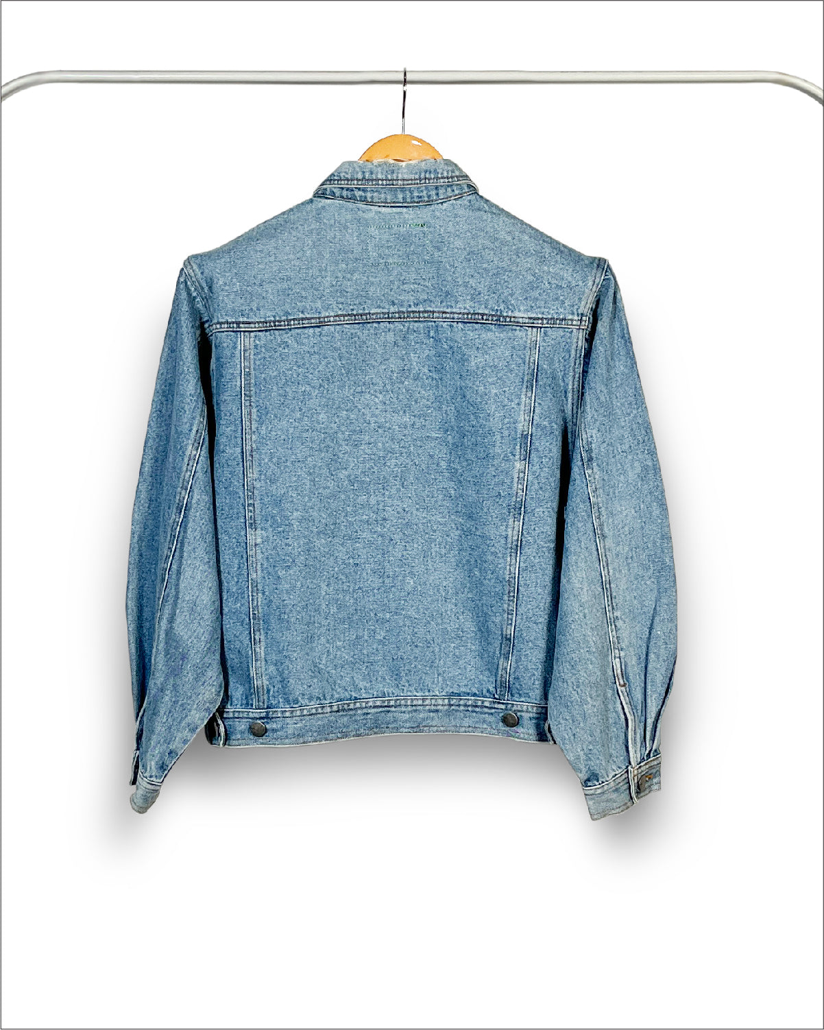 Women's mid indigo trucker denim jacket. An iconic jacket style with a slim casual cut, spread collar, pointed flap chest pockets, button tab waist adjusters, and two V-shaped seams that run from chest pocket to waist. It features Un Denim's signature GreenPocket™ that says - ‘I pledge to waste less, crave less, use less and reuse more. I pledge to rescue our future.'