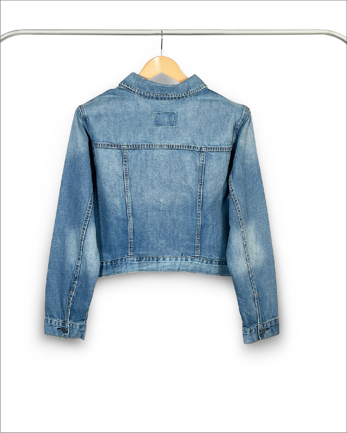 Women's mid indigo trucker denim jacket. An iconic jacket style with a slim casual cut, spread collar, pointed flap chest pockets, button tab waist adjusters, and two V-shaped seams that run from chest pocket to waist. It features Un Denim's signature GreenPocket™ that says - ‘I pledge to waste less, crave less, use less and reuse more. I pledge to rescue our future.'