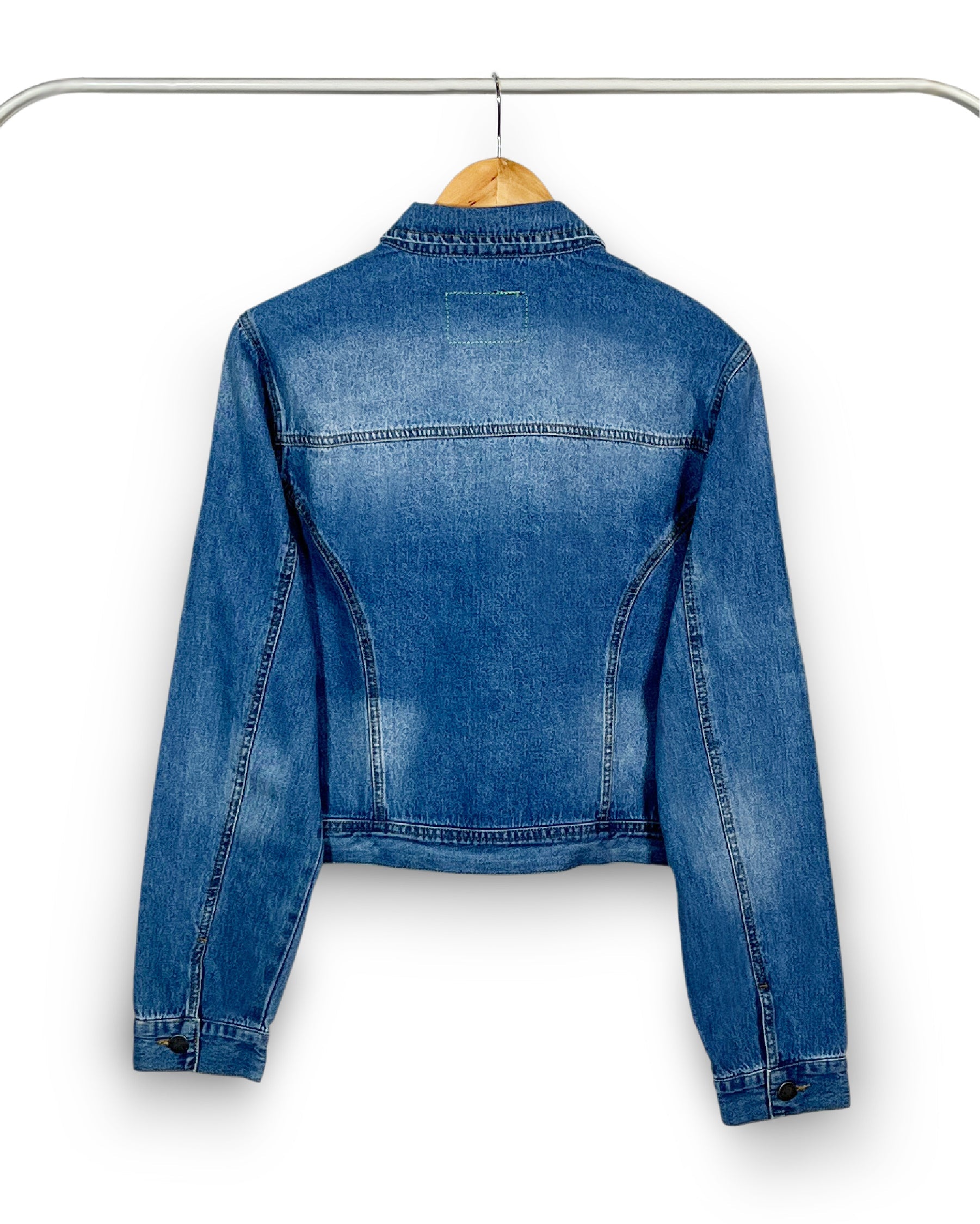 Women's mid indigo trucker denim jacket. An iconic jacket style with a slim casual cut, spread collar, pointed flap chest pockets, button tab waist adjusters, and two V-shaped seams that run from chest pocket to waist. It features Un Denim's signature GreenPocket™ that says - ‘I pledge to waste less, crave less, use less and reuse more. I pledge to rescue our future.'