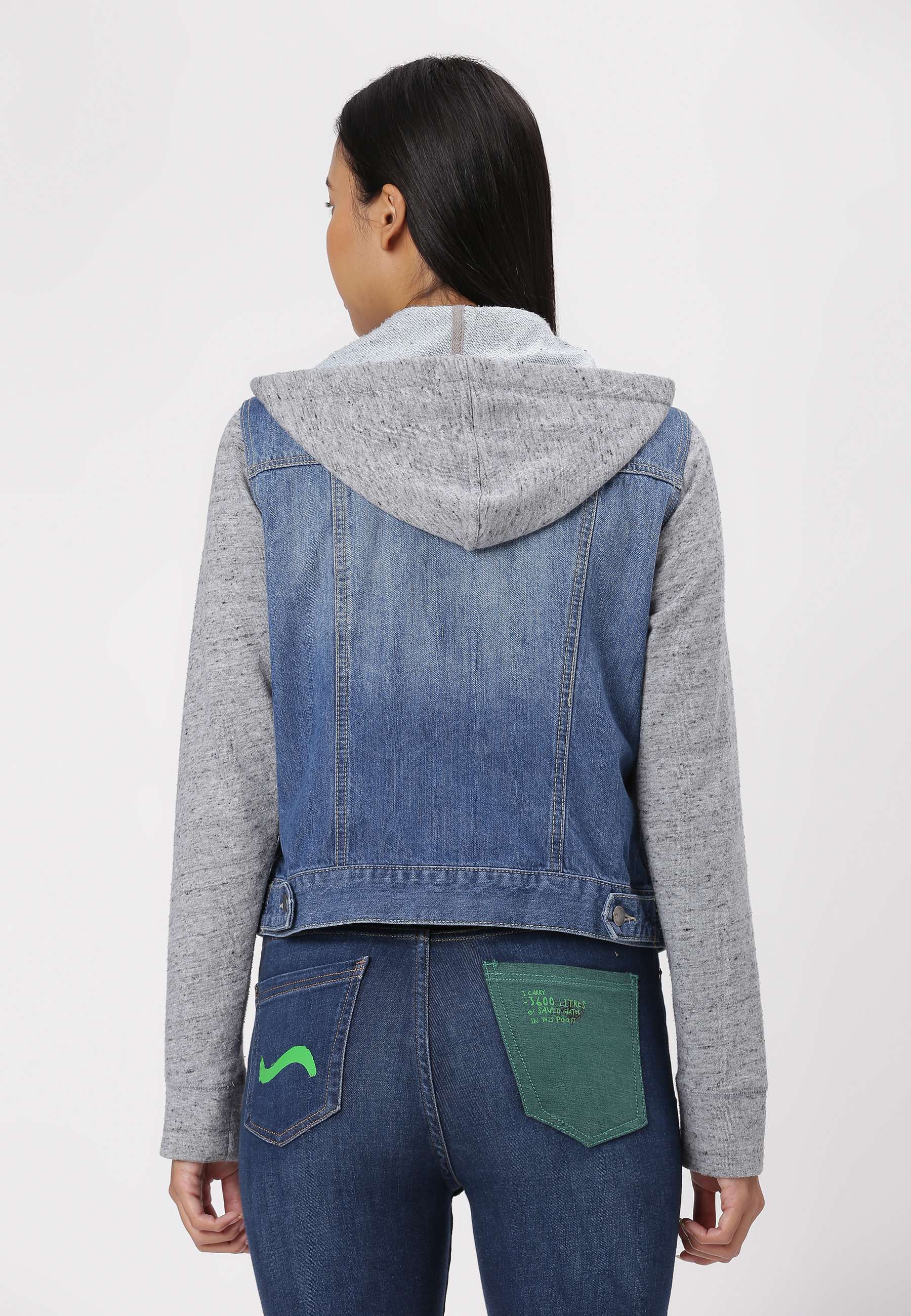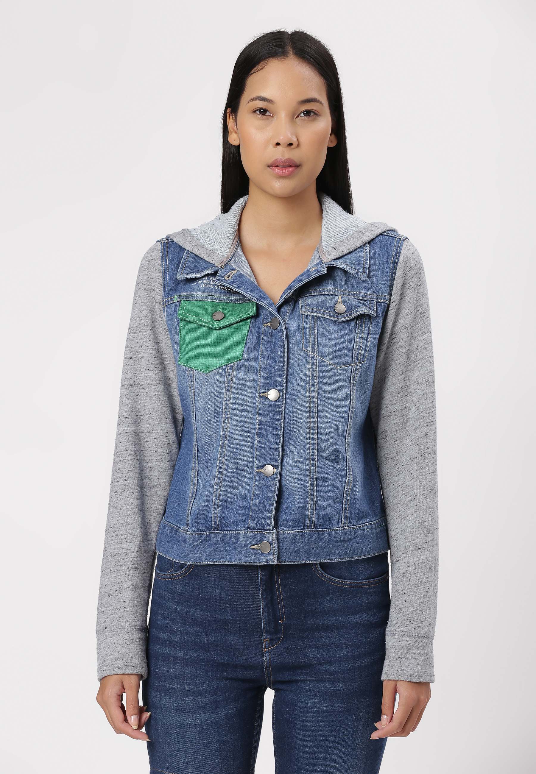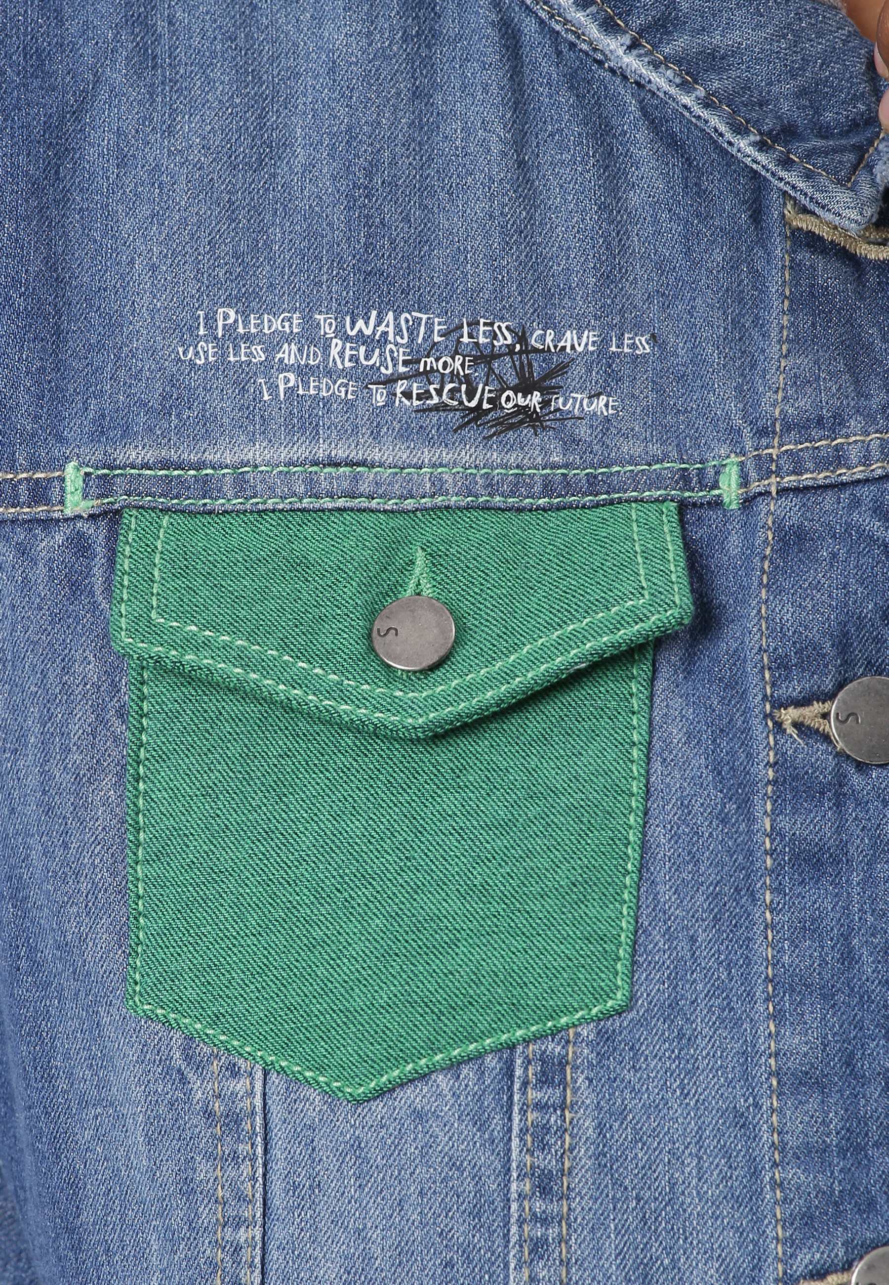 Women's mid indigo trucker denim jacket. An iconic jacket style with a slim casual cut, spread collar, pointed flap chest pockets, button tab waist adjusters, and two V-shaped seams that run from chest pocket to waist. It features Un Denim's signature GreenPocket™ that says - ‘I pledge to waste less, crave less, use less and reuse more. I pledge to rescue our future.'