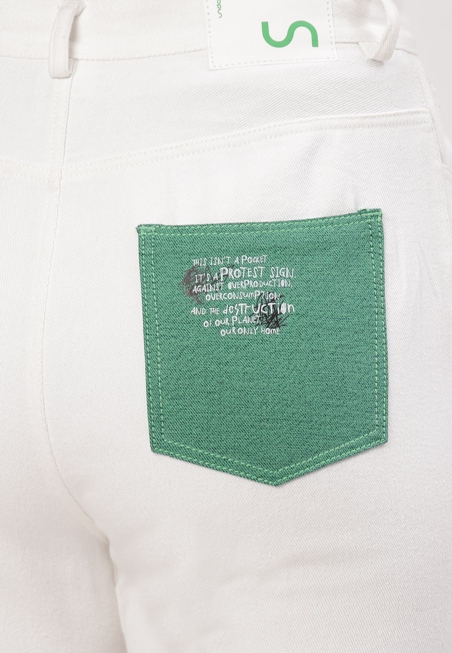 Women's white straight denim shorts that sit high on the waist with narrow leg openings. They fit fuller through the hip and thigh and run straight from hip to hem. They feature Un Denim's signature GreenPocket™ that says - ‘This is not a green pocket, it’s a protest sign, against overproduction, overconsumption and the destruction of our planet, our only home.’