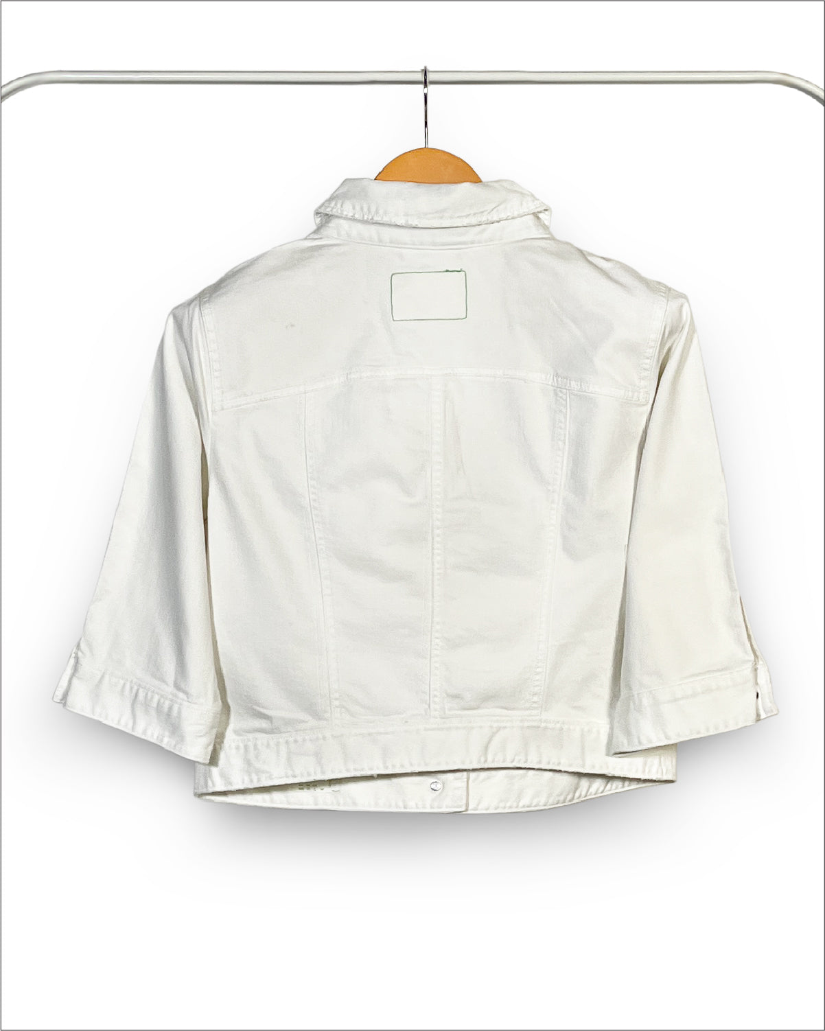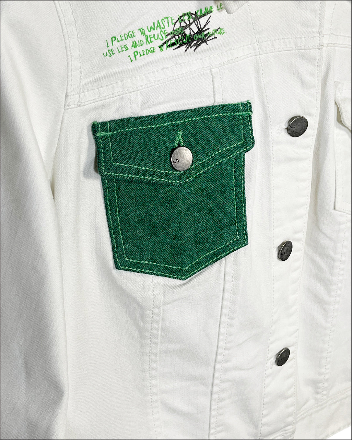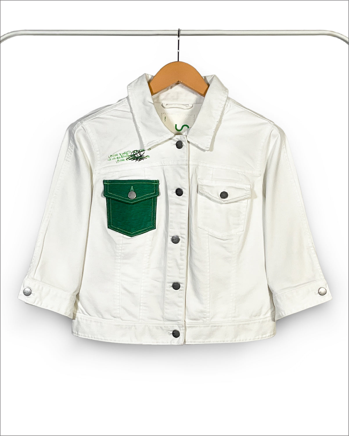 Women's white trucker denim jacket. An iconic jacket style with a slim casual cut, spread collar, pointed flap chest pockets, button tab waist adjusters, and two V-shaped seams that run from chest pocket to waist. It features Un Denim's signature GreenPocket™ that says - ‘I pledge to waste less, crave less, use less and reuse more. I pledge to rescue our future.'